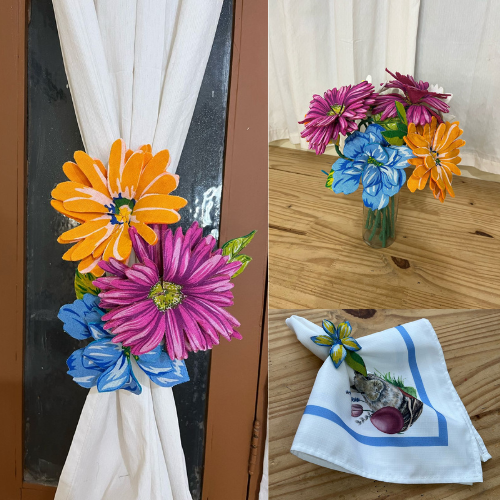 Prendedor de cortina que vira arranjo floral e predendor de guardanápos